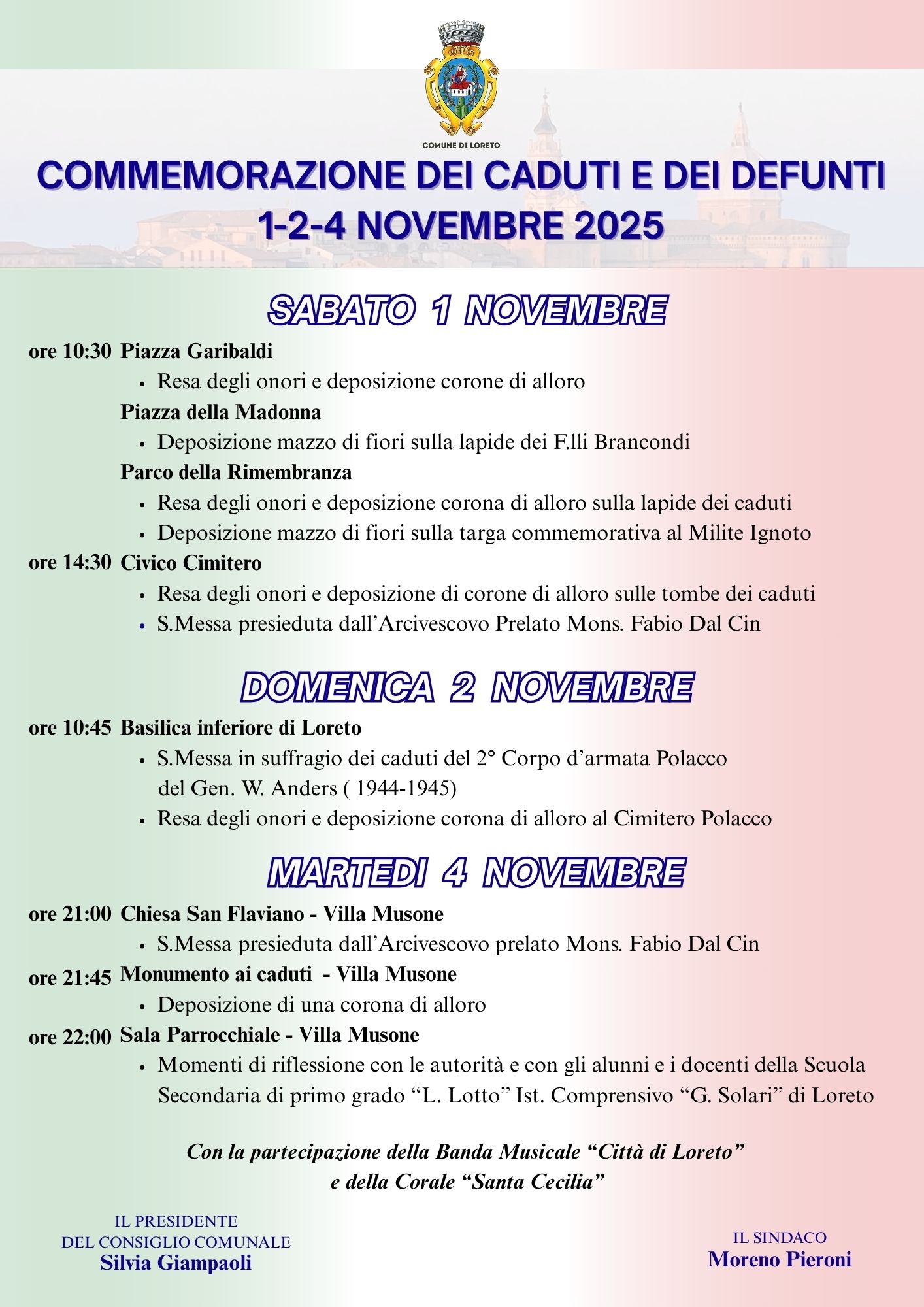 Programma delle celebrazioni riguardanti le commemorazioni dei Defunti e dei Caduti a Loreto